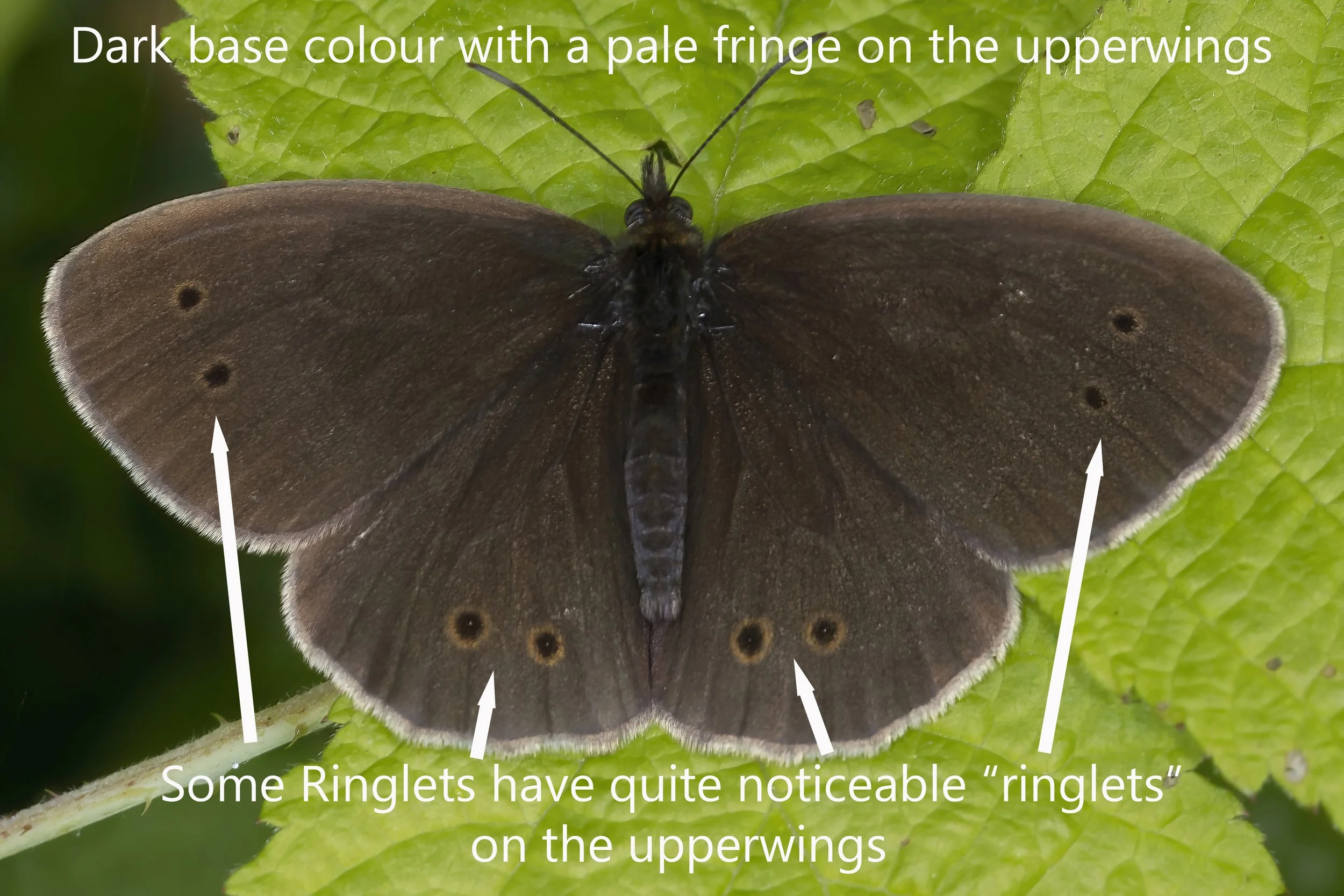 The upperwings can be a bit trickier to tell apart from the male Meadow Brown. However, the Ringlet has no orange at all on the forewings, unlike the male Meadow Brown. The Ringlet has a dark brown base colour and a pale fringe to the upperwings. There are often dots, or “ringlets”, showing on the upperwings but these can be somewhat variable in their appearance. Quite often the “ringlets” are barely noticeable as in the photo below.